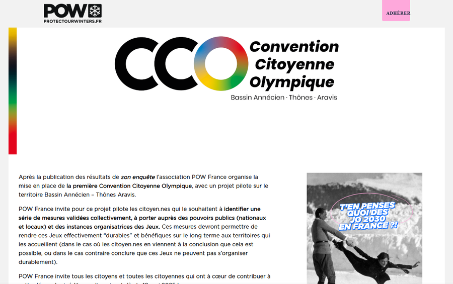 Lorsque notre collectif avait pris connaissance dans la presse du lancement d’une Convention Citoyenne Olympique pour le bassin Annécien - Thônes - Aravis par l’association POW France, Hugo, porte-parole de notre collectif, a envoyé à POW FRANCE sa non candidature à la Convention Citoyenne Olympique !