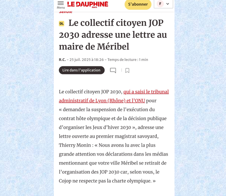 Le 18/07/2025, nous avons pris connaissance dans la presse des déclaratons du maire de Méribel, mentionnant que la ville Méribel se retirait de l’organisation des JOP 2030 car selon le maire, le COJOP ne respecte pas la charte olympique.