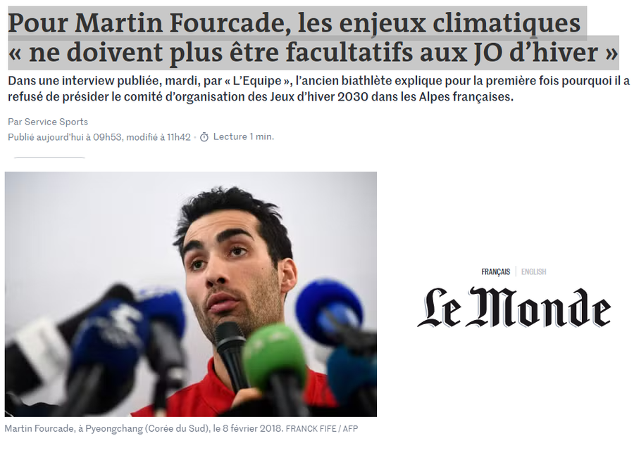 « L’ambition de cet essai n’est pas de faire le procès des JO, mais de comprendre ce qu’ils révèlent de nos territoires montagnards à l’heure d’un inévitable chamboulement », précise l’auteur. Un essai plus que jamais nécessaire[2] tant cette candidature est teintée d’opacité et qui tombe fort à propos avec le nouveau rebondissement de cette semaine ; le renoncement de Martin Fourcade pour la présidence du Cojop (Comité d’organisation des Jeux).