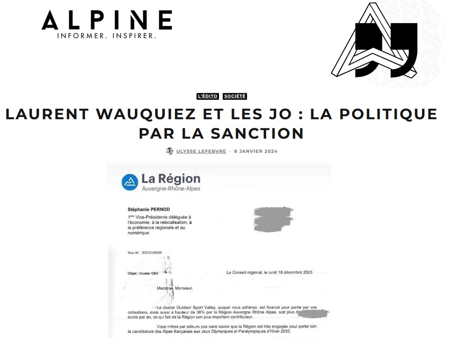 Bras droit de Laurent Wauquiez, elle écrit noir sur blanc dans une lettre destinée aux membres de l’association d’entreprises Outdoor Sport Valley (OSV) basée à Annecy, qu’elle va demander le retrait de la subvention régionale de 620 000€ qui lui est allouée. La raison ? Le soutien de l’OSV à un appel d’associations pour l’organisation de JO plus durables. Vous lirez la lettre reproduite dans cet article. Faut-il rappeler que M. Wauquiez lui-même appelait cet été à l’organisation des « premiers JO d’hiver durables« .